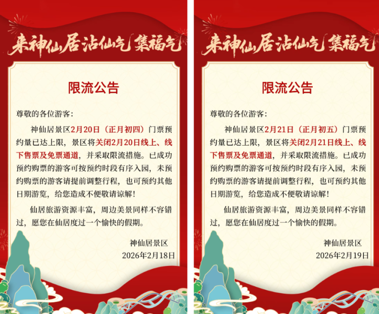 台州神仙居景区发布公告称,2月20日(正月初四)、2月21日(正月初五)门票预约已满,将采取限流措施。