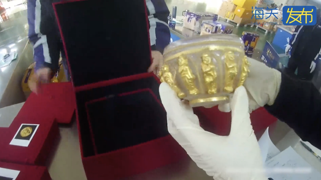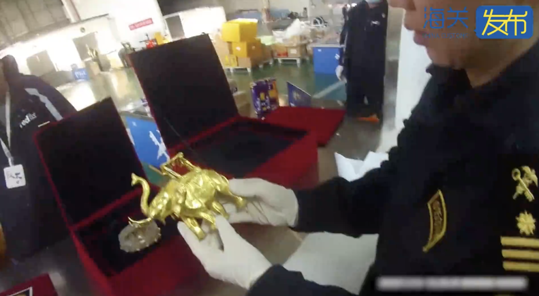 现场关员在对一票申报为“铜摆件、石头摆件、陶瓷摆件”的快件查验时发现疑似文物。经鉴定,疑似文物中金饰件4件、水晶嵌金佛钵1件、金象1件为清代文物,属于国家禁止出境的一般文物。