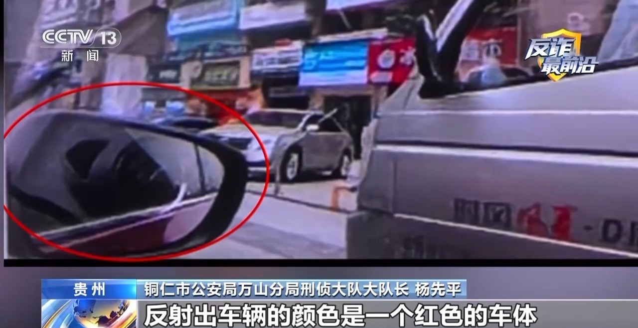 铜仁市公安局万山分局刑侦大队大队长 杨先平:嫌疑人坐在副驾驶朝车外拍了一张照片,告诉被害人自己所处的位置,通知被害人在这个地点进行交易,然后我们通过一个细微的镜头,就是反光镜中反射出车辆的红色车体。