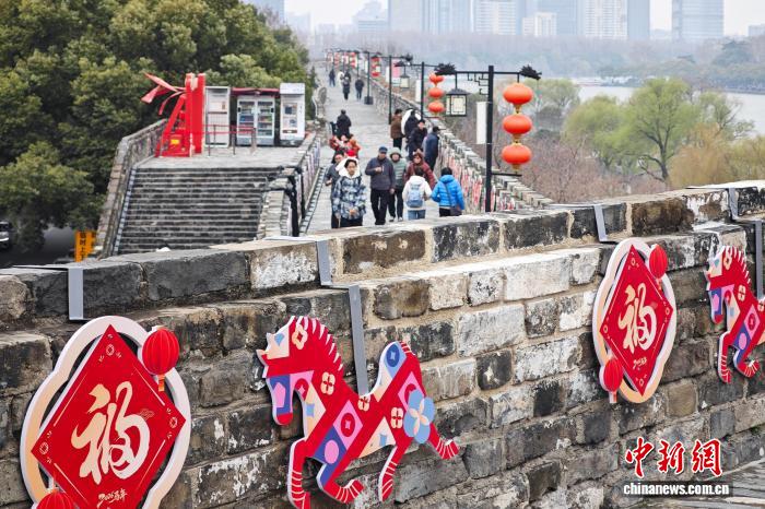 3月4日,江苏南京,市民登上有着600多年历史的明城墙,在布置的马年新春装置前留影。中新社记者 泱波 摄