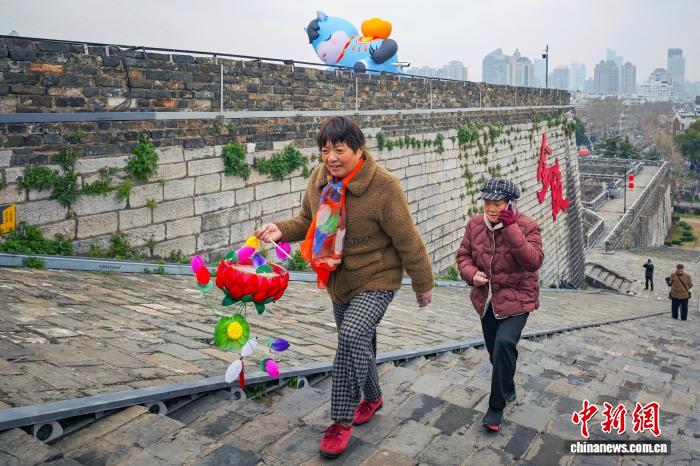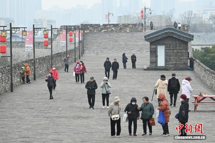 3月4日,江苏南京,市民登上有着600多年历史的明城墙欣赏风景。当日是农历正月十六,当地民间素有“正月十六爬城头”的习俗,称之为“踏太平”“走百病”。中新社记者 泱波 摄