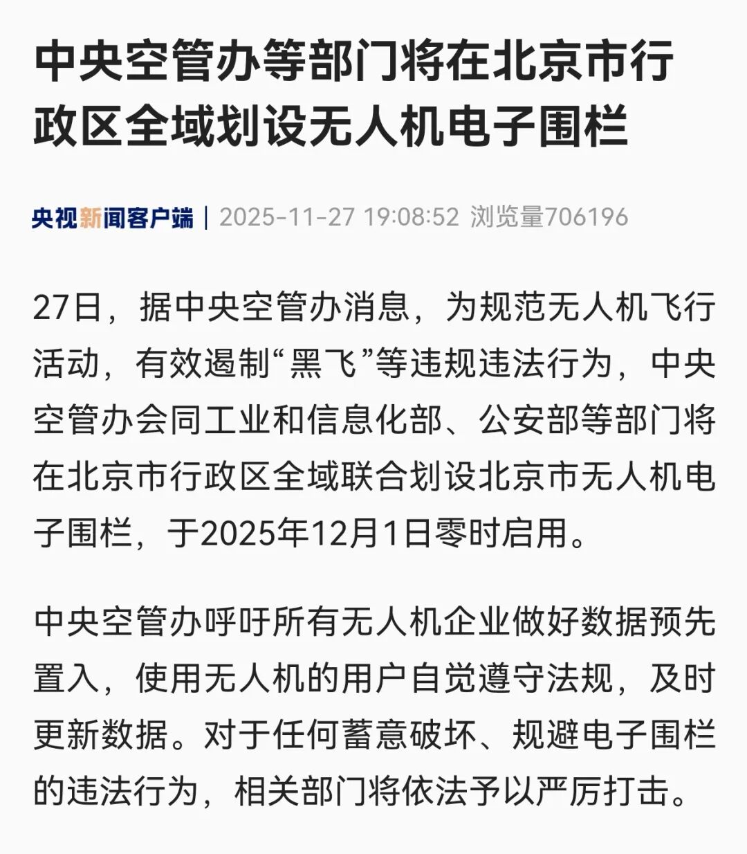 请广大市民群众和在京单位自觉遵守无人驾驶航空器管理有关规定,积极举报各类违法违规行为,共同维护空中秩序和公共安全。北京警方将持续加大对无人机“黑飞”等违法违规行为的查处力度,强化巡逻防控和宣传引导,警民携手共同守护首都蓝天。