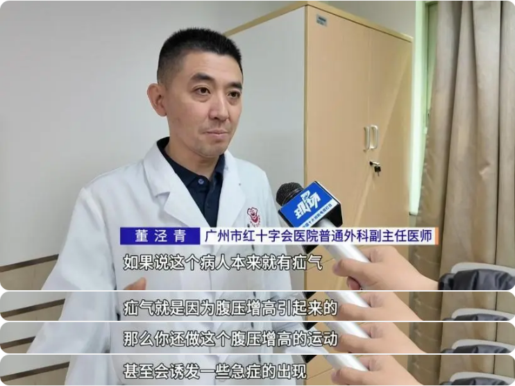 广州市红十字会医院普通外科副主任医师 董泾青:“如果说这个病人本来就有疝气,比如他有脐疝、腹股沟疝或者有其他地方的疝,他本身就有疝。疝气就是因为腹压增高引起来的,那么你还做这个腹压增高的运动,他可能会加重这个疝气,甚至会诱发一些急症的出现。那还有一些更严重的,一些手术后的病人,不管是做开刀的大手术也好,开胸的手术也好,或者一些微创的手术也好,也不适合做这些运动。”