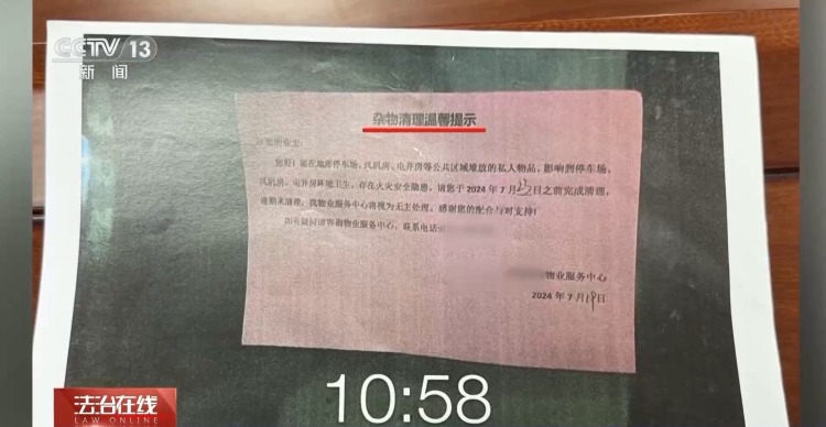 被告物业公司工作人员 邱先生:上面明确说的是2024年7月23日之前必须得处理,如果没人领取,那就是当无主处理,标识得很明确。我们一直也还在等,还在延期,延期了大半个月,始终还没有人领。