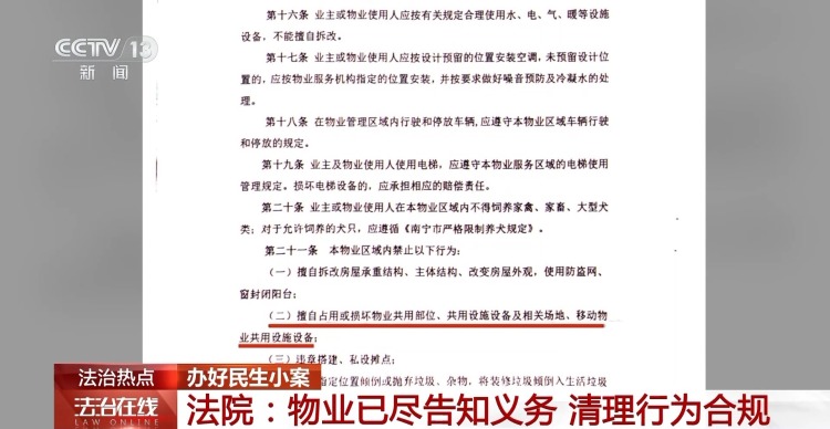 南宁市江南区人民法院立案庭法官 李珊:原告没有在规定的时间内清理物品,在物业公司贴出温馨提示后,长达一个月的时间内也没有清理物品。物业公司在无法联系原告的情况下,为了保障全体业主的共同利益以及正常的生活秩序,也为了维护小区的消防安全,就安排了废旧回收人员上门回收堆放的杂物,法院认为这个行为并无不当。