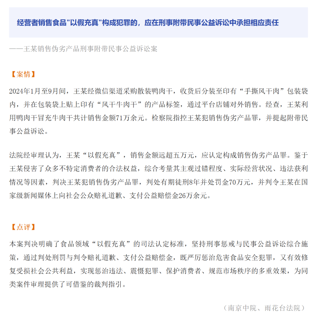 2024年1月至9月间,王某经微信渠道采购散装鸭肉干,收货后分装至印有“手撕风干肉”包装袋内,并在包装袋上贴上印有“风干牛肉干”的产品标签,通过平台店铺对外销售。经统计,王某利用鸭肉干冒充牛肉干共计销售金额71万余元。雨花台区检察院指控王某犯销售伪劣产品罪,并提起附带民事公益诉讼。