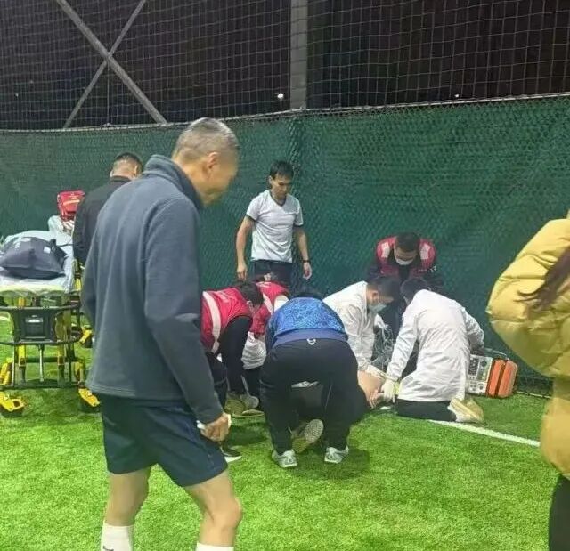坐在球场不远处办公室里的金涛和郝铭几位球场管理人员也飞奔赶来,拿来了AED(自动体外除颤器)。有人已经拨通了120急救电话,打开视频由医生远程指导。