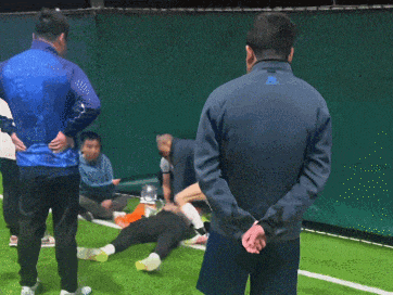 第一分钟,在场上踢球的球员黄文者和陈光晖率先冲了上去。陈光晖跪在倒地的球员身边,掀开衣服直接开始心肺复苏,动作十分标准:掌根紧贴胸部,两手十指交叠,双臂伸直,用上半身力量垂直按压。队友华能也紧随其后,准备随时接替。