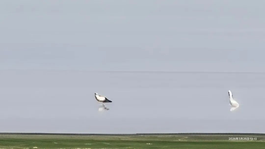 3月29日,潘新民观察到嬉子湖上空飞过一群北飞的小天鹅。“它们飞过湖面的时候降低了高度,一直在鸣叫,不知道是不是想召唤这只小天鹅一起飞走。但最后它还是没走。”