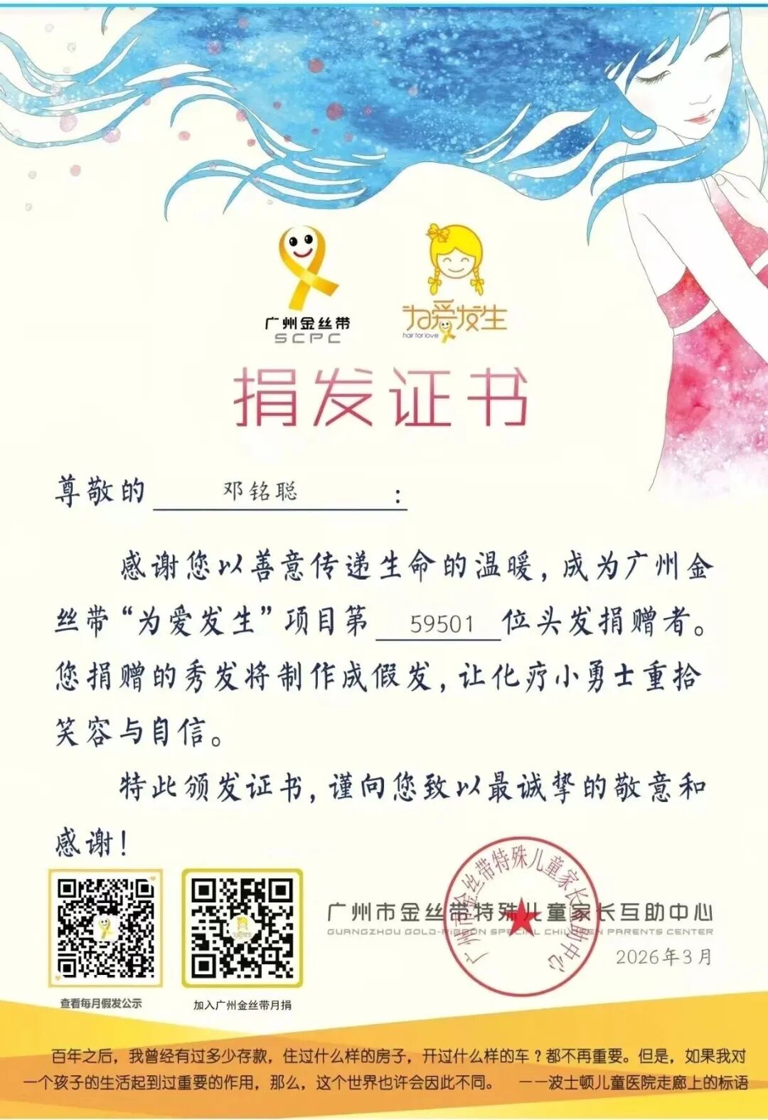 “有同学开玩笑,说我是不是要走‘文艺路线’,还有人问我是不是遇到什么事了。”邓铭聪说,每次他都会跟大家讲捐发的意义,讲化疗患儿掉发后的烦恼,慢慢地,大家从不理解变成了支持,“有室友还主动帮我买护发素,说让我把头发养得更好看,能给小朋友做一顶更舒服的假发。”
