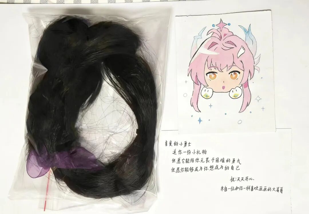 “那时候年纪小,不懂事,在补习班遇到一个戴假发的学姐,我脱口问了句‘你怎么戴假发’,后来才知道她是化疗掉光了头发。我一直后悔,不该问这句话。”在湖北大学,邓铭聪向记者回忆捐发的初心,“这份遗憾在我心里埋了快十年,我就想着,一定要用实际行动弥补,去帮更多像她一样受病痛折磨的孩子。”