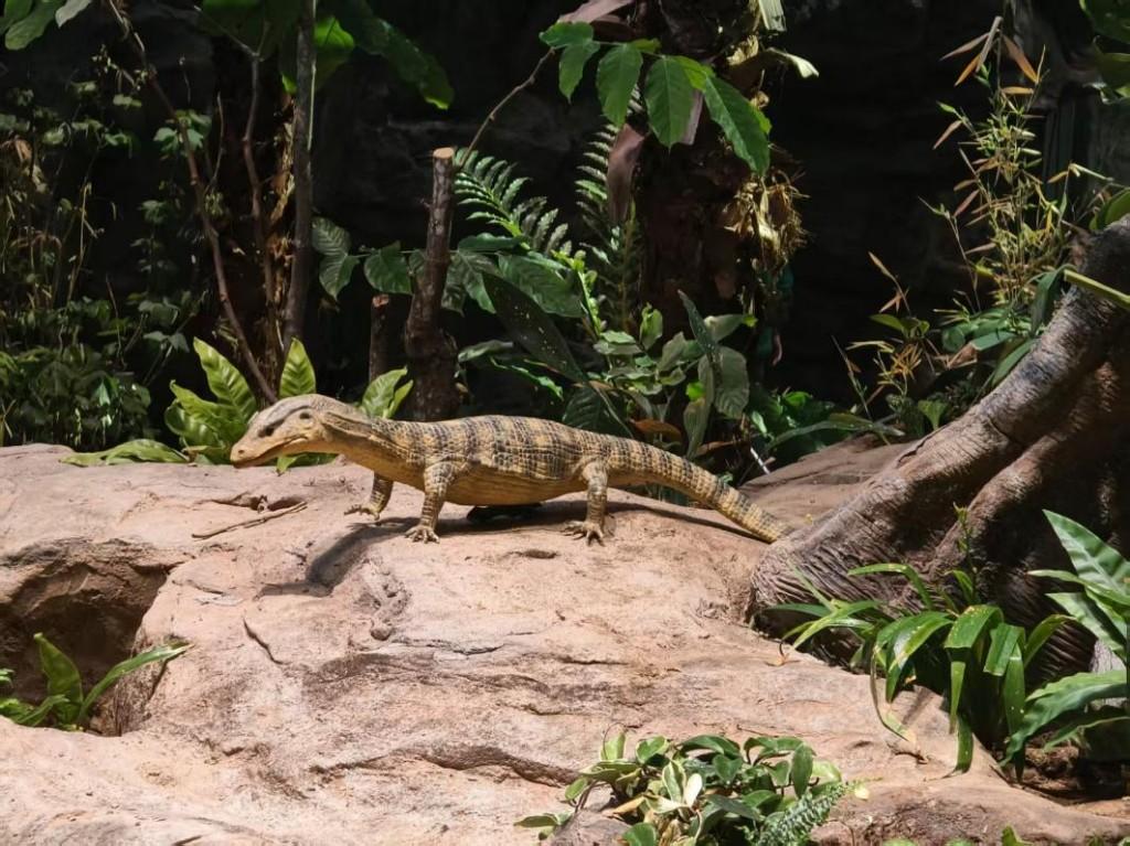 沿阶梯缓步下行,一只栩栩如生的圆鼻巨蜥模型映入眼帘,神态灵动逼真。再往前走,耳畔传来蝙蝠的声响,抬头就能看见忽明忽暗的洞穴里有黑影拂过。这里便是“魅力雨林”主题区,展区采用活体植物与仿真造景相结合的方式,还原西双版纳热带雨林原生生态,带领观众观察热带雨林里奇特的生命现象、体验专业的科考设备与雨林科学研究方法。展区内的“雨林小屋”陈列着红外相机、热感应相机、光合仪、显微镜等一线科考设备,带领观众近距离感受科研工作者的真实工作场景。