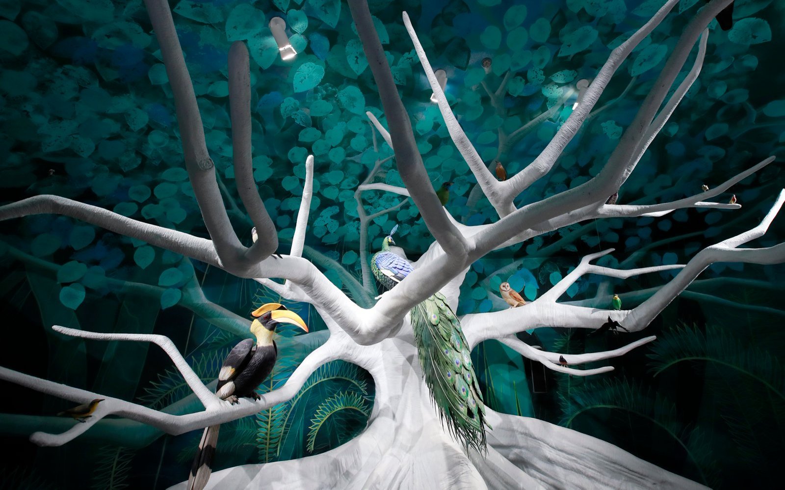 在“雨林故事”主题区里,巨树上栖息着美丽的孔雀、红腿小隼、绿翅金鸠等珍稀鸟类模型,一旁还陈列着各种仿生技术的应用——仿猫头鹰空气动力学的冷却风扇、仿鸟类羽色光子晶体材料、仿鸟爪设计的SNAG无人机、仿啄木鸟减震结构、仿象鼻灵巧机械臂等,生动展现了从自然智慧到科技创新的转化路径。