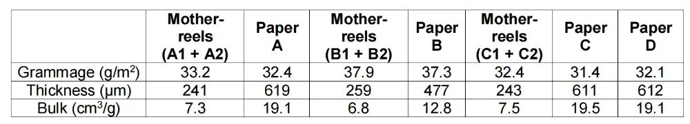 比如,2020年发表在《生物资源》(BioResources)上的一项研究,就对比了几组不同质地的卫生纸压花和不压花的厚度、蓬松度等参数。