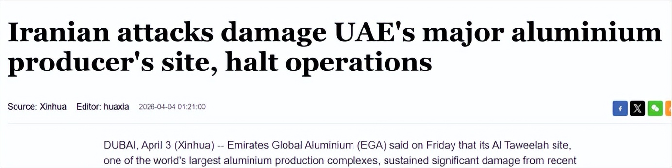 EGA在声明中表示,位于阿布扎比的Al Taweelah冶炼厂遭导弹和无人机重创后已进入紧急停产状态。公司已完成初步损害评估,并正与可能受到货物延误影响的客户保持沟通。