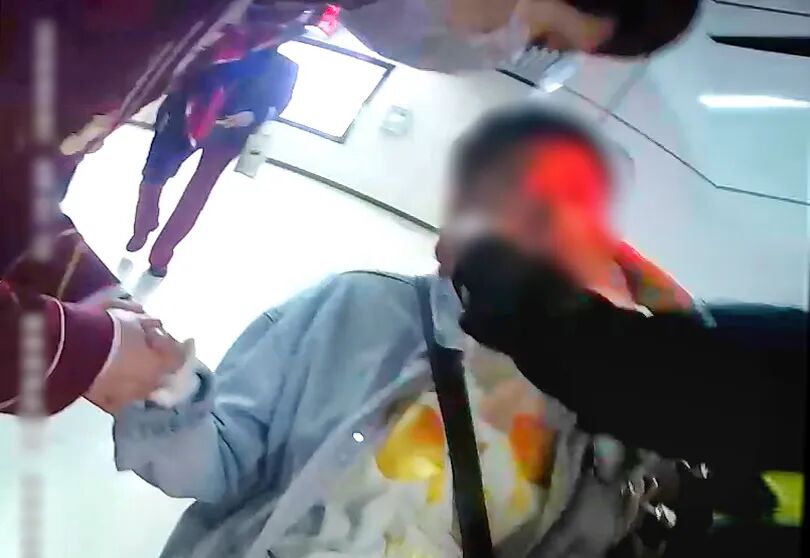 地铁工作人员用塑料袋罩住乘客口鼻,帮助呼吸。