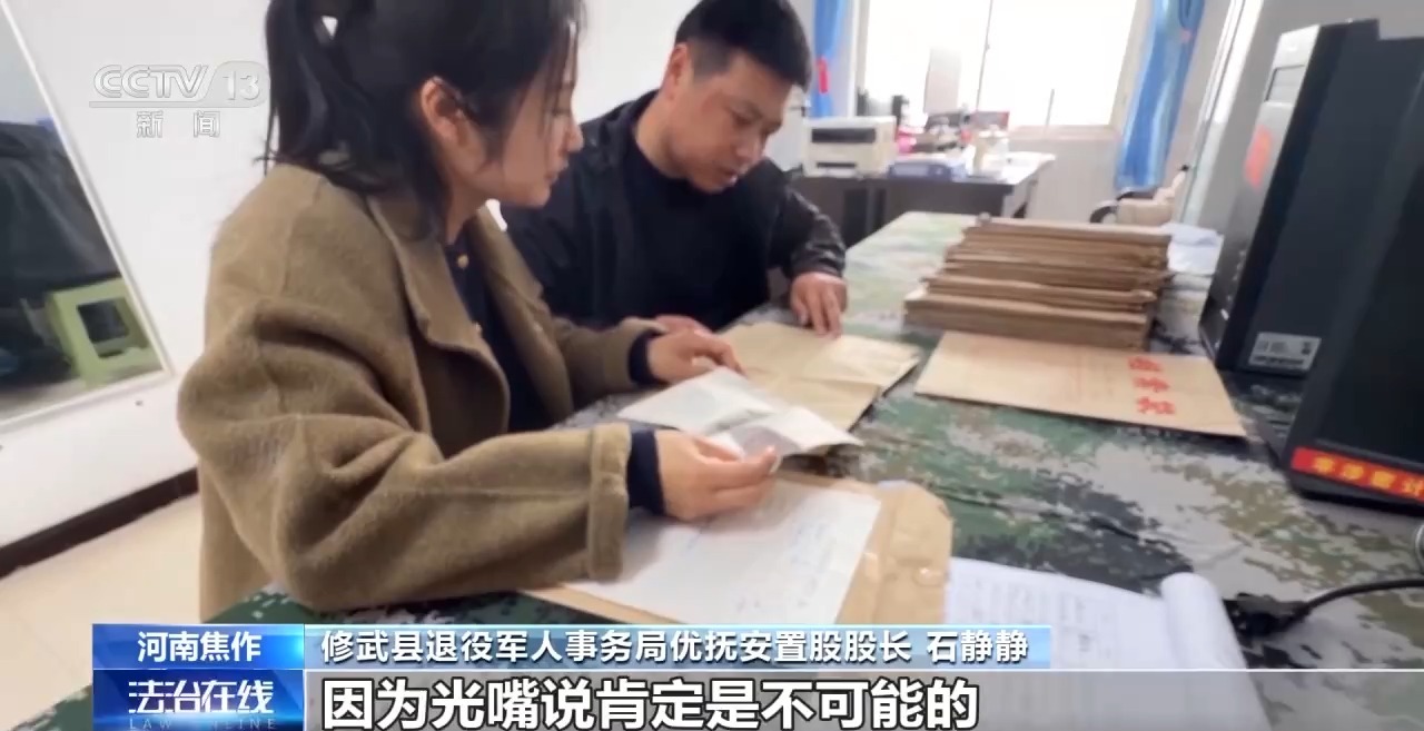 修武县退役军人事务局优抚安置股股长 石静静:这边我先把他资料简单看看,然后再往上面反映一下,看看能不能找到有啥依据,因为光嘴说肯定是不可能的。