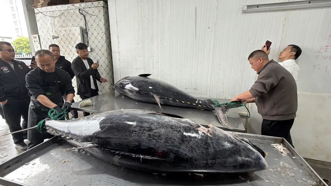 6日14时30分,两条巨型蓝鳍金枪鱼顺利运抵温岭。船老大委托当地一家水产超低温速冻公司代为储存和销售。后续,这两条鱼将经过精细分割处理,通过线上线下方式分批上市销售。