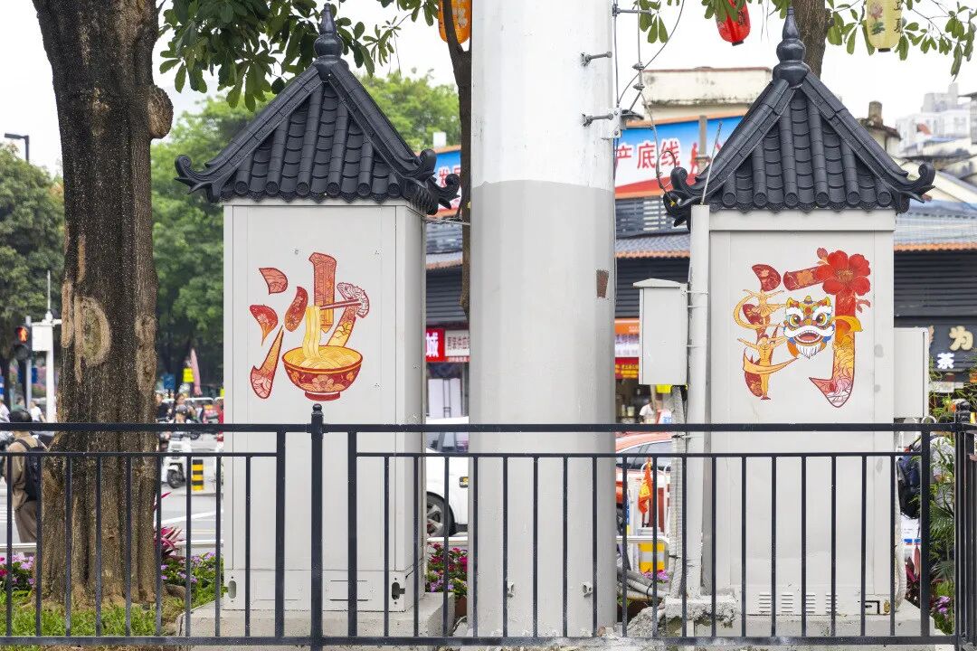 第一幅公开的作品引得工友、居民以及街道的称赞,这给了骆仕岳很大鼓舞。彼时,沙河街启动了“扮靓电箱”的计划,骆仕岳参与其中,一下班就拿起画笔在街头巷尾创作,他画笔下的木棉花、醒狮、大熊猫、向日葵、海棠花出现在这座老街区的一个个电箱上。
