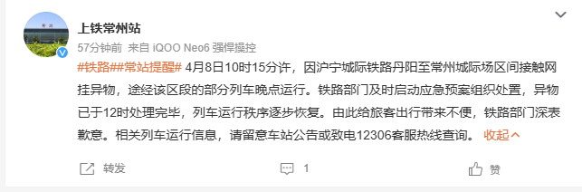 @上铁常州站官微发布最新情况说明称,4月8日10时15分许,因沪宁城际铁路丹阳至常州城际场区间接触网挂异物,途经该区段的部分列车晚点运行。铁路部门及时启动应急预案组织处置,异物已于12时处理完毕,列车运行秩序逐步恢复。由此给旅客出行带来不便,铁路部门深表歉意。相关列车运行信息,请留意车站公告或致电12306客服热线查询。