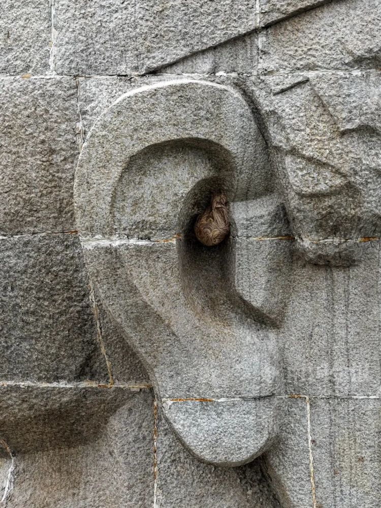 雕像耳朵中的马蜂窝。记者何俊涛 摄