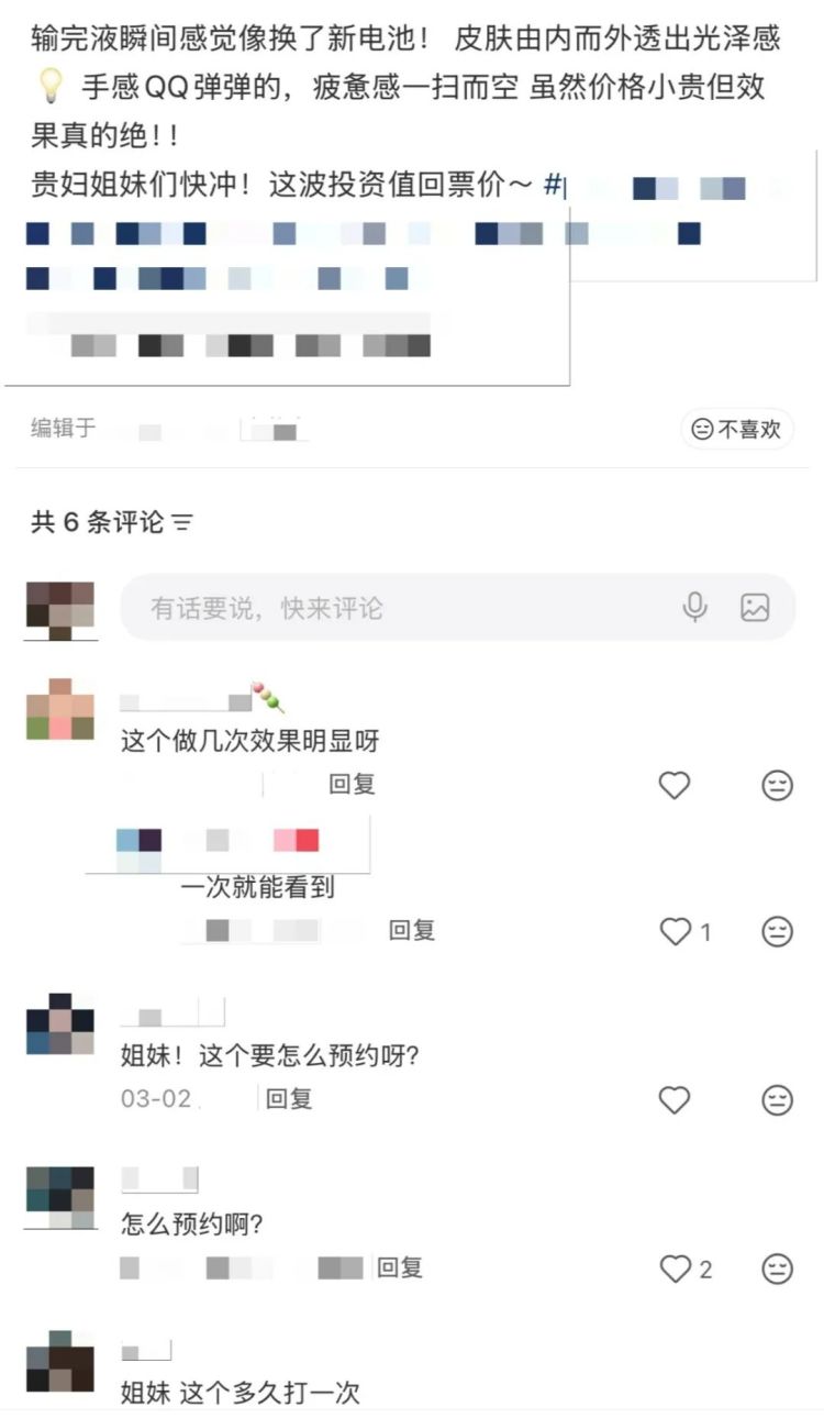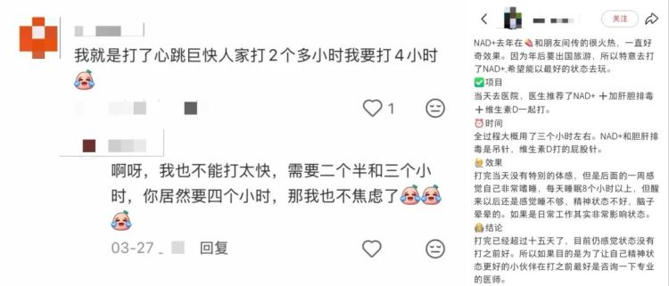 刘女士说:“NAD+的药物我们没做,一个是不合规,还有一定的风险。已经有不少客户来咨询过,他们在网上看到帖子和视频,说注射后可以让身体状态好起来、延缓衰老,就会觉得这个东西好像很厉害。但这种药的使用对注射的场所有要求,并且在医美行业的作用没有获批。”
