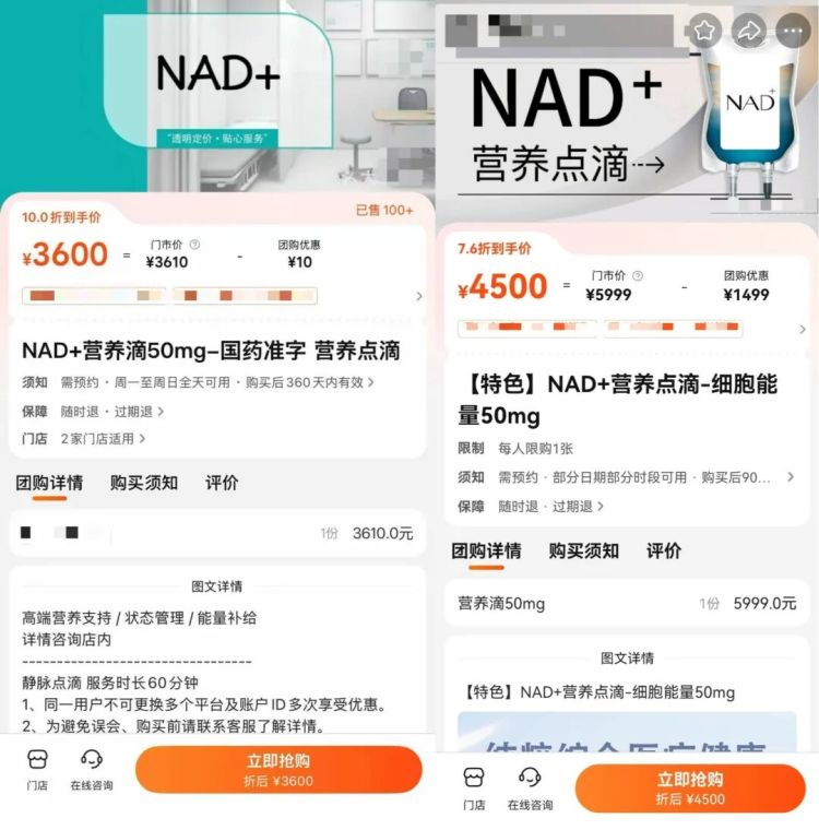 记者在某消费点评网站检索“NAD+营养”相关词条后看到,50毫克的营养点滴有商家售价4500元,也有商家25毫克报价2800元。NAD+被商家赋予了多重功效,号称想打都能打。