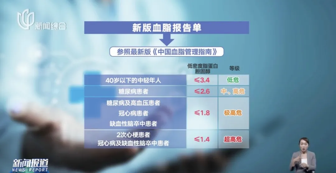 专家特别提醒,根据最新版的《中国血脂管理指南》,临床上被称为"坏胆固醇"的"低密度脂蛋白胆固醇",不同人群的指标要求并不相同,健康人群,目标值是小于3.4;但像郭先生这样,出现过心梗的,就属于极高危人群,目标值设置得要更加严格。