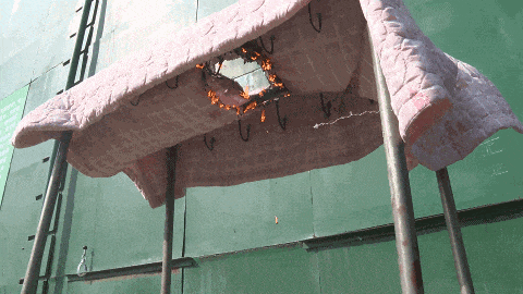 在消防模拟场景中,楼下有人晒被子,楼上的住户从窗口往外扔出一根未熄灭的烟头。大约1分钟后,被子出现明火,且被烧出一个洞。