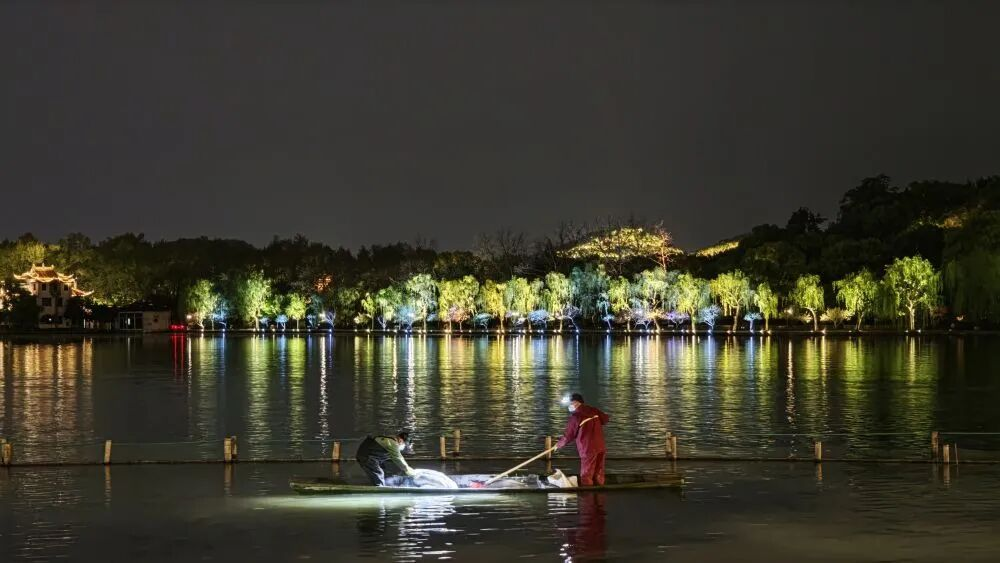 4月8日晚,工作人员在西湖清理荷塘