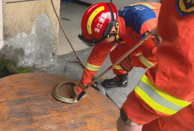 4月6日夜里,还是在拱墅区,一学校老师报警学校里有蛇。据报警师生描述,这条不速之客在室外管道夹缝里游走,大伙儿也不敢轻易动手。消防员穿戴防护装备,手持捕蛇器轻步靠近。这条约一米长的蛇盘踞在夹缝中,两名队员默契配合,迅速将其装入蛇皮袋,动作干脆利落。