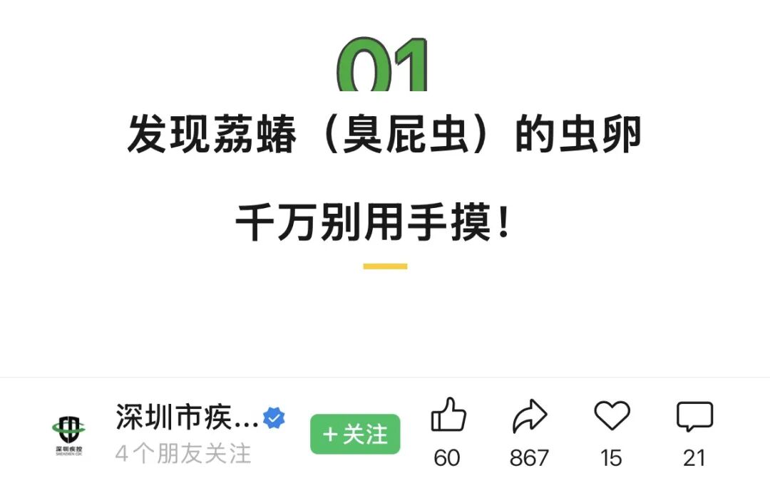 △深圳市疾控中心发文提醒:千万别用手摸臭屁虫的虫卵