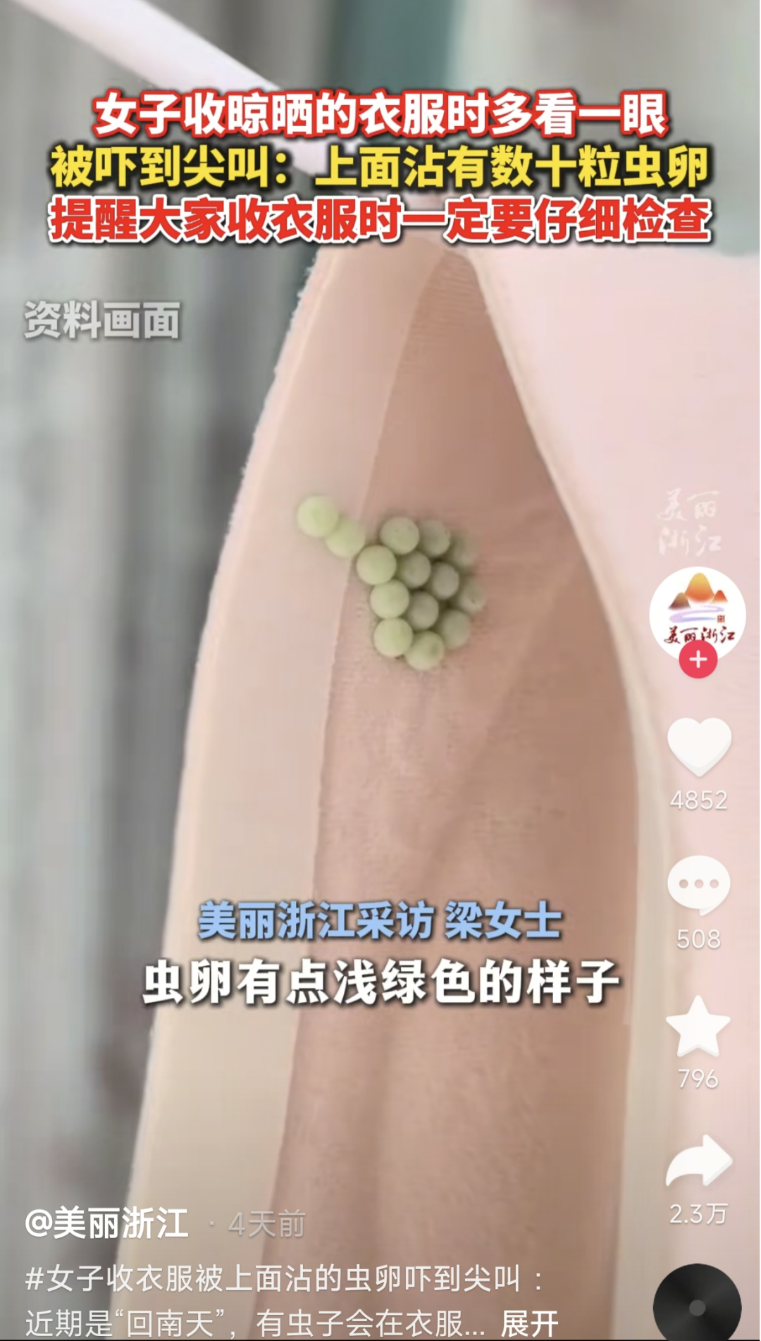 晾晒在阳台的衣物、毛巾等质地柔软,潮湿度刚好,又带着淡淡芳香,容易吸引臭屁虫在上面产卵,所以干了就尽快收!