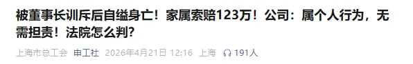 据上海市总工会申工社介绍:一员工因报销事宜被董事长当众训斥、通报批评,心态彻底崩溃,最终其自缢身亡,家属一纸诉状将公司告上法庭。