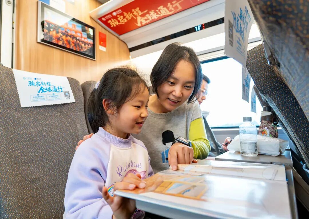 正值春游旺季,不少家庭带娃出行。列车上的“流动书屋”准备了各类儿童读物和科普书籍,还有专门的“读书打卡点”,鼓励孩子们在阅读的同时,记录列车途经的每一个站点。