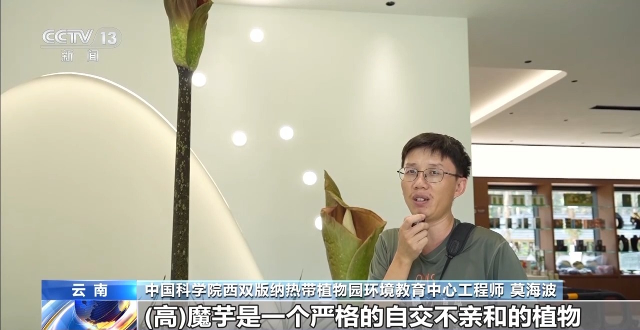 中国科学院西双版纳热带植物园环境教育中心工程师 莫海波:在野生情况下能长到3到4米高。现在是第一次开花。高魔芋是一个严格的自交不亲和的植物,它虽然上面有雄花也有雌花,但是雄花、雌花是分时段成熟的,要想让它结果是非常困难的。