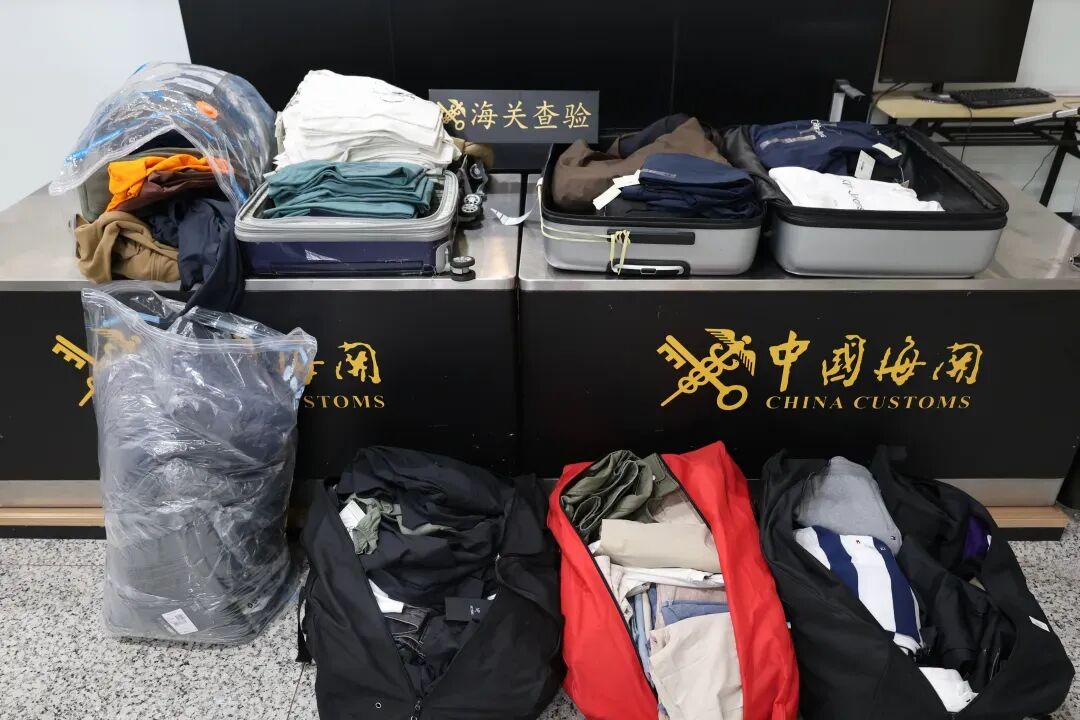 此前,海关关员在对一架入境航班进行监管时,发现1名选择“绿色通道”通关的旅客携带多件行李入境且行李机检图像异常。经现场关员开箱清点,发现旅客携带大量品牌服饰共计350件,价值超20万元人民币。目前,海关已按规定对上述物品暂不予放行。