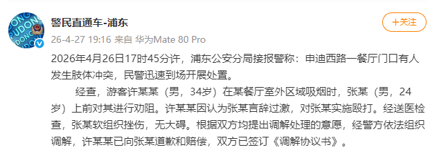 2026年4月26日17时45分许,浦东公安分局接报警称:申迪西路一餐厅门口有人发生肢体冲突,民警迅速到场开展处置。