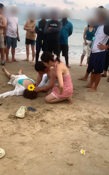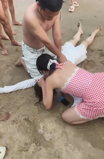 姜智文一次又一次精准有力地按压,妻子袁苑每一次吹气后都偏头看溺水女子的胸廓起伏,嘴角沾满了泡沫,也只是随手一擦,再俯身、吹气。周遭惊慌焦急的情绪笼罩,几步之外,海浪一遍遍冲刷着沙滩。