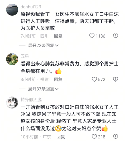 很多网友说,夫妻俩一看就专业,急救完了也不急着站起来,而是一直拍打女子肩膀、查看瞳孔、呼喊......