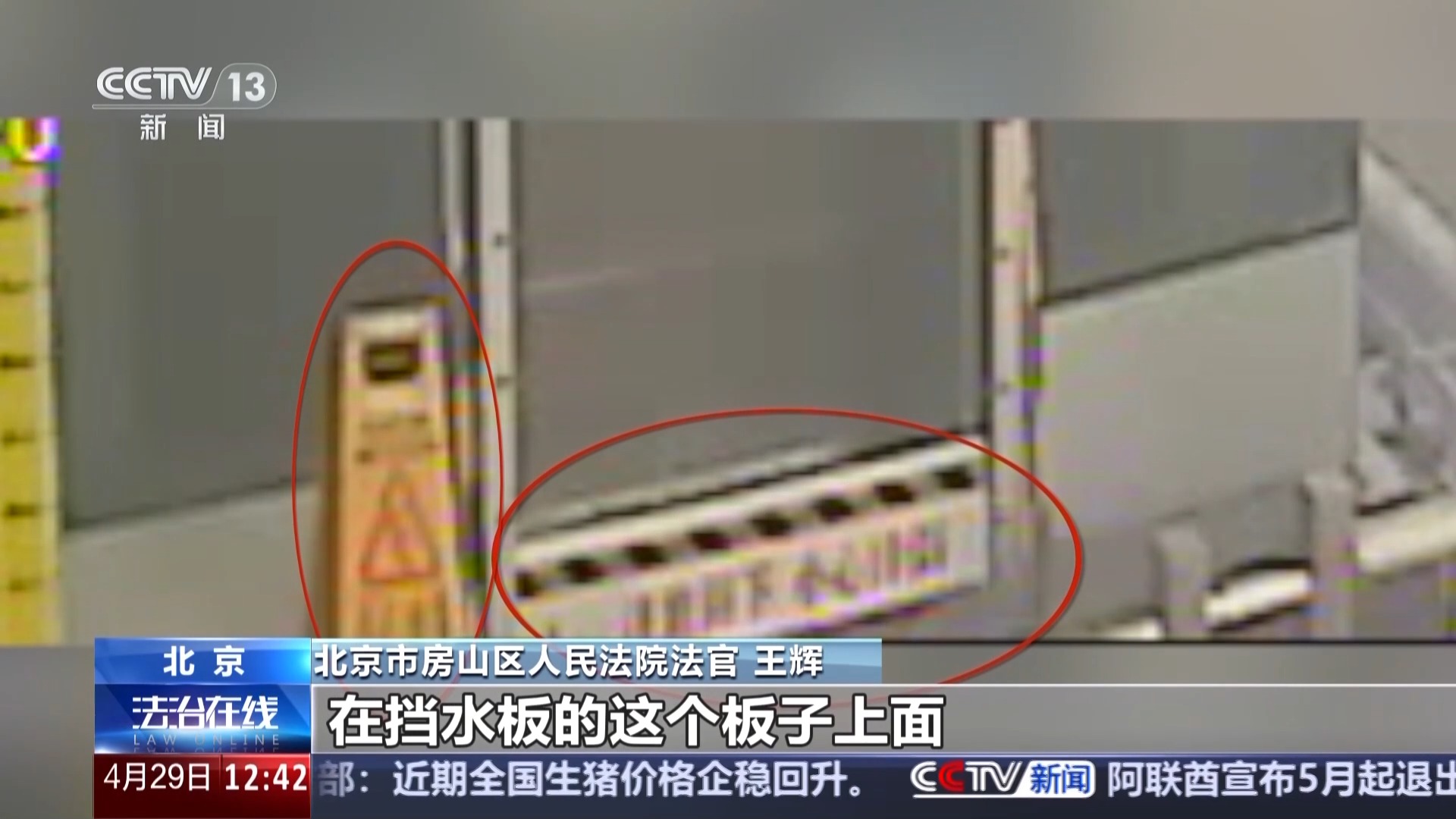 北京市房山区人民法院法官 王辉:挡水板的一侧设置了一个黄色的警示牌,在挡水板的板子上面有双色的条纹,是比较明显的那种警示条纹。然后还明确写了注意脚下这几个大字,从这个挡水板的外侧来看,地面是平整光滑的,没有任何异物,也就是说这个乘客如果尽到谨慎的注意义务的话,可以完全避免被这个挡水板绊倒的。