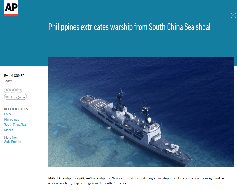 美联社称,“德尔皮拉尔”号是菲律宾军方从美国手中收购的三艘前美国海岸警卫队巡逻舰之一,是菲律宾最大战舰。