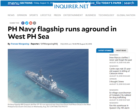 “德尔皮拉尔”号是菲律宾从美购入的三艘前美国海岸警卫队巡逻舰之一,一度是菲最大军舰。该舰于8月29日晚间搁浅。