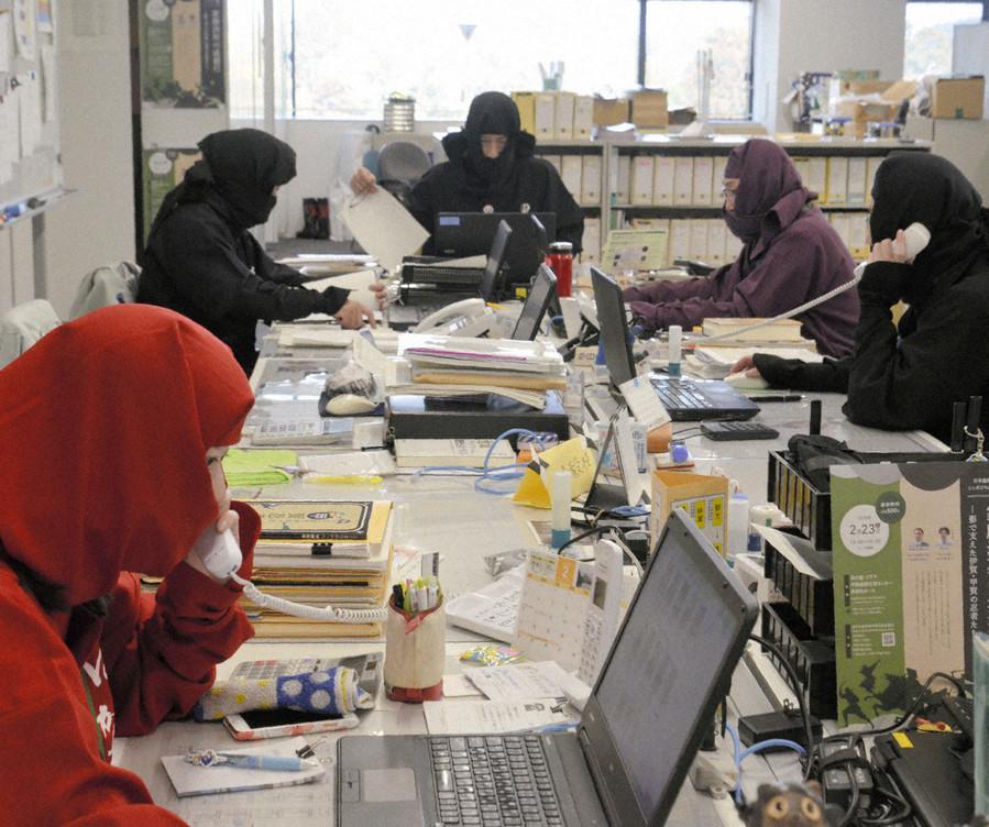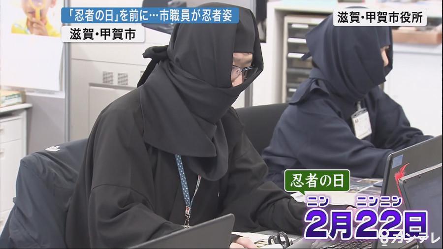 这30人都是甲贺市政府观光企划推广课的职员。为了配合“忍者之日”,他们穿上包裹住全身,仅露出眼睛的忍者装束来单位。这些忍者服有红色、藏蓝色、黑色等多种颜色,十分显眼。“忍者职工”们在座位办公、出面接待到访者,甚至会用忍者的口吻接电话。