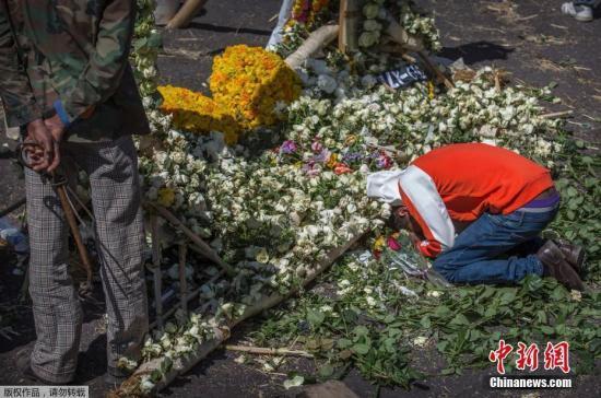 法国民航安全调查分析局(BEA)3月16日表示,已经成功提取了埃塞俄比亚失事客机驾驶舱语音记录器中的数据,交给了埃塞方面的调查人员。图为坠机现场仍有遇难者家属在悼念亲人。