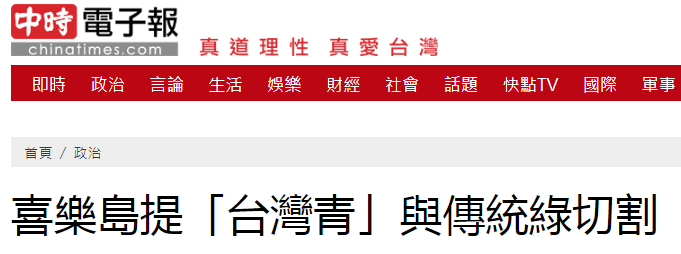 据台湾“中时电子报”6日报道,“喜乐岛联盟”总召集人郭倍宏6日称,“喜乐岛”的盟色将设为“台湾青”,与绿色做出区隔。他称,传统绿色阵营支持民进党,民进党主张“维持‘中华民国’在台湾的现状”,“台湾青”则主张所谓的“台湾前途必须由台湾人决定。”