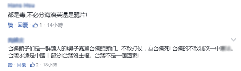 还有网友直言,都是毒,不必分海洛因还是鸦片;台湾永远是中国一部分↓
