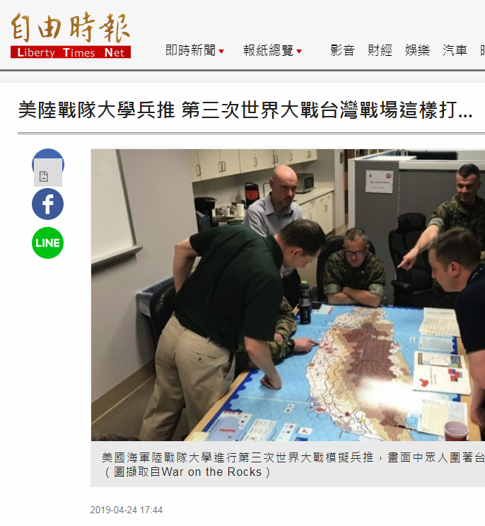 这篇报道4月24日刊登在《自由时报》,题为:“美陆战队大学兵推 第三次世界大战台湾战场这样打…”↓