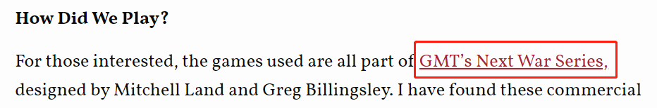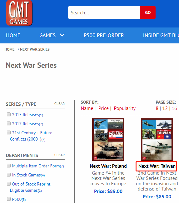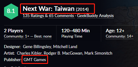 文章还在桌游的名字上给了相关链接,点击之后进入的果然是厂商“GMT”的网页,其列出的桌游也包含“下一战争:台湾”