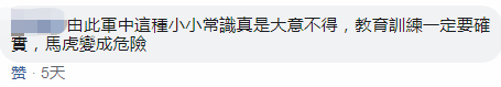 更有人分析,这件事体现的是台军“整个体系的腐烂”:阿兵哥连基本防护装备怎样穿都不知道,代表体系的教育训练与知识化,是极其不及格的;在李喜明周围的一堆官,到底是一堆前后不分的蠢材,同样对基本防护装备的使用没有任何狗屁概念。